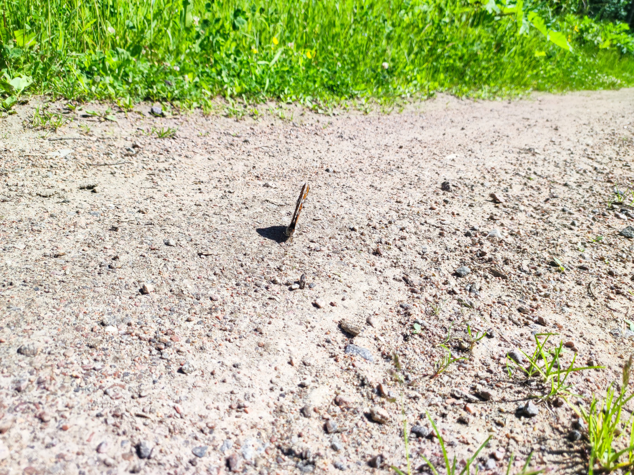 Снимок сделан на грунтовой дорожке в яркий день: бабочка стоит на песчано-гравийной поверхности, крылья сложены вертикально, силуэт выглядит тонким и «стреловидным». От насекомого падает чёткая тень, вокруг видны мелкие камешки и зернистая фактура дороги. На заднем плане тянется полоса зелёной травы и растений, дорожка уходит вправо, создавая глубину сцены. Фотография подойдёт для иллюстраций о насекомых, полевой биологии, сезонных наблюдениях, экологии и летних прогулках по тропам.