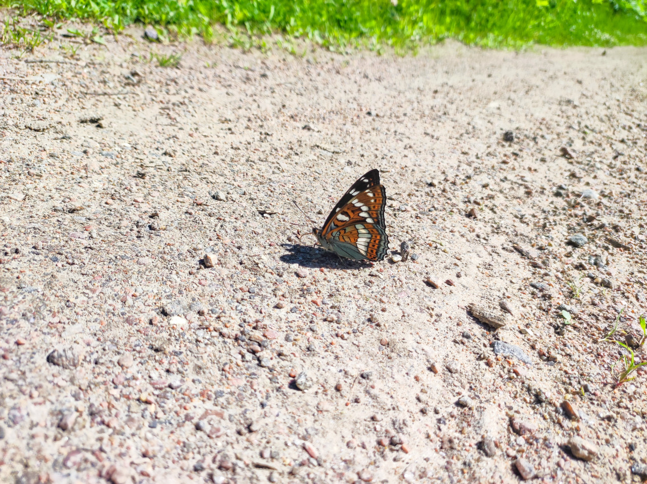 Бабочка в профиль на гравийной тропинке среди летней зелени