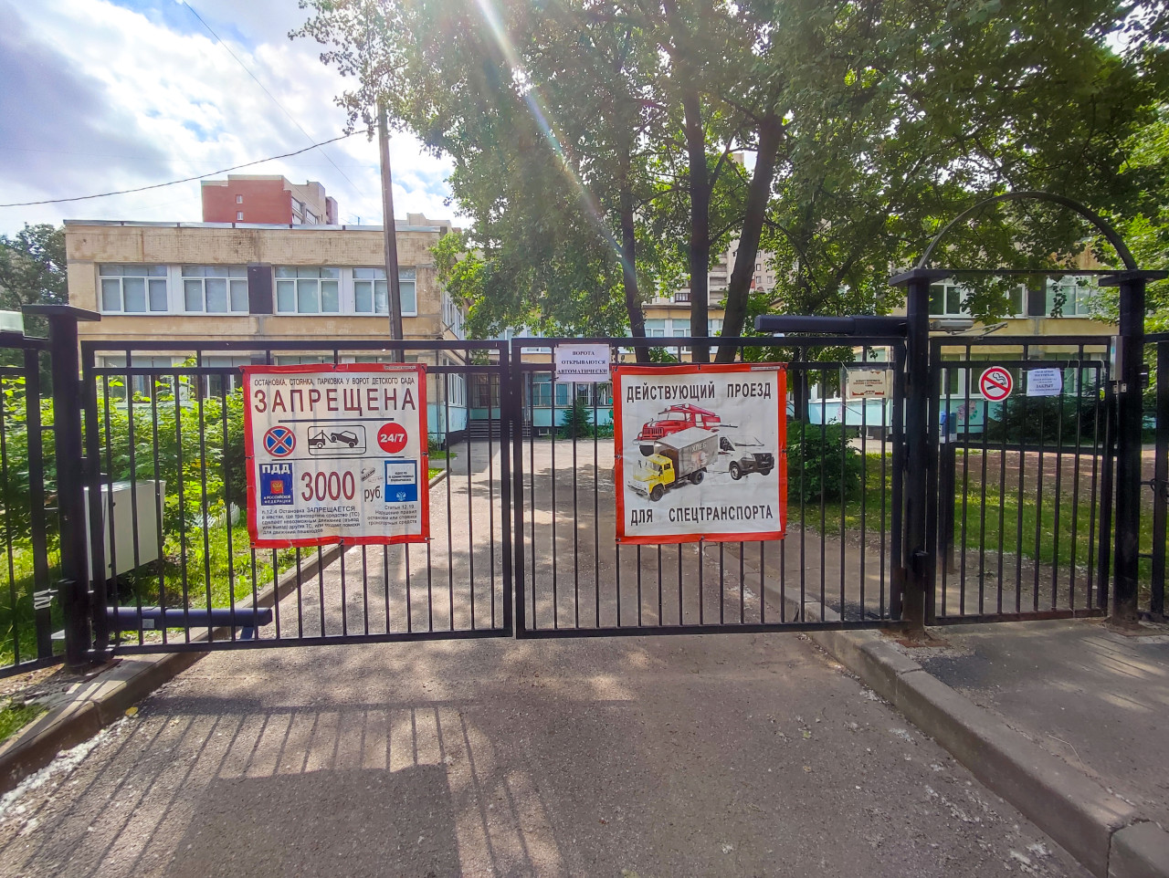 Автоматические ворота детского сада с баннерами о запрете парковки и проезде спецтранспорта