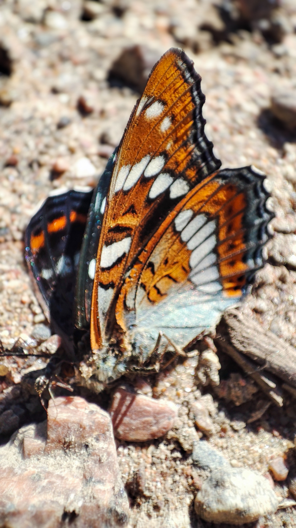 Крупный вертикальный кадр бабочки с контрастным оранжево-белым рисунком на крыльях и тёмной волнистой каймой. Насекомое сидит на песке с галькой и камнями, крылья подняты, что позволяет рассмотреть прожилки и чешуйчатую структуру поверхности. На заднем плане заметно сильное боке, подчёркивающее объект съёмки, а свет яркий, дневной, с бликами на песчинках. Снимок выполнен на улице в тёплый сезон. Фото подходит для материалов о бабочках, макрофотографии, биоразнообразии и летних наблюдениях на природе.