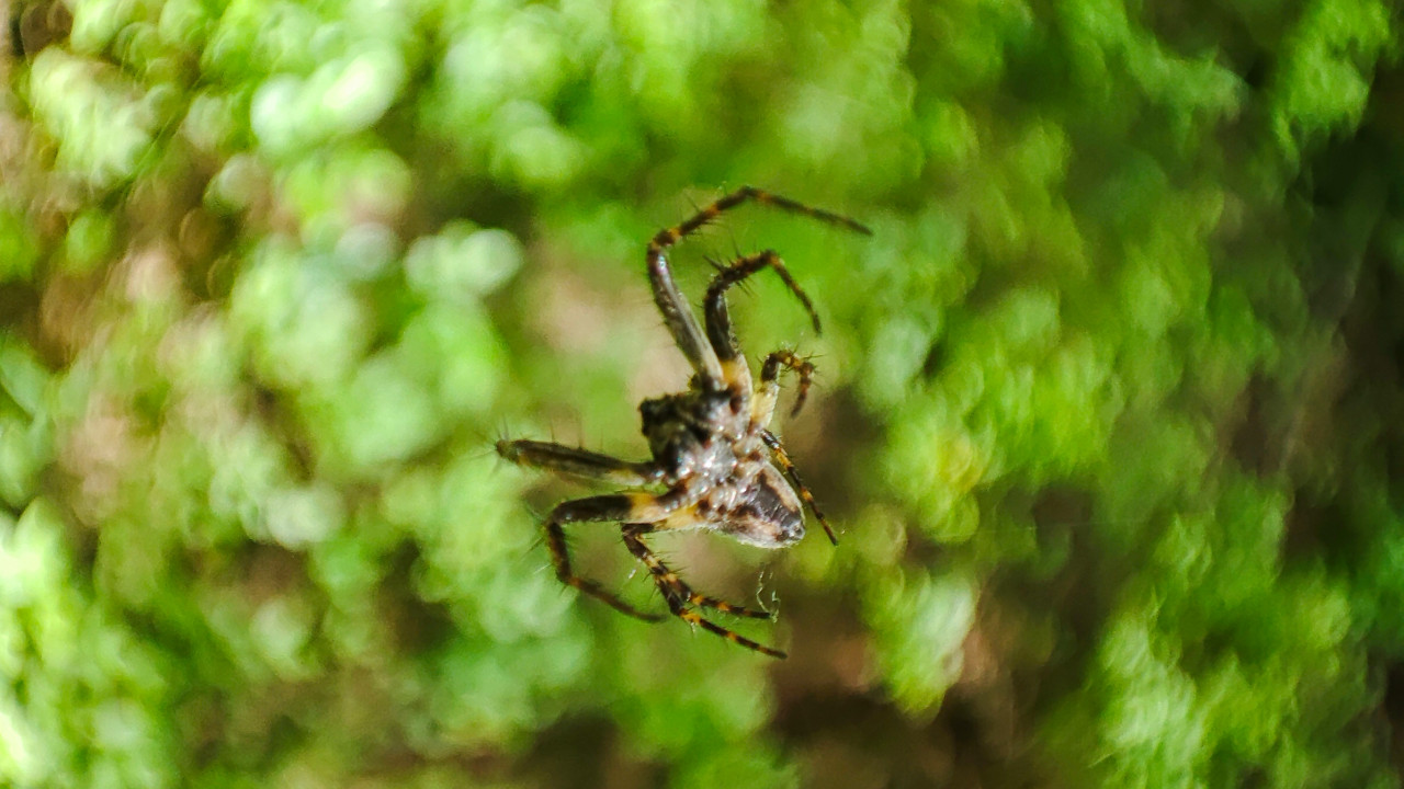 Макроснимок паука, зависшего на тонких нитях паутины: видны изогнутые лапки с шипиками, сегменты тела и отдельные нити, уходящие в размытый фон. Задний план заполнен мягким зеленым боке из листвы и травы, что указывает на съемку в лесу или парке в теплый сезон при дневном свете. Кадр подходит для материалов о биоразнообразии, энтомологии и городских экосистемах, иллюстраций про паутину, охоту пауков и микромир природы, а также для экологических публикаций и учебных проектов.