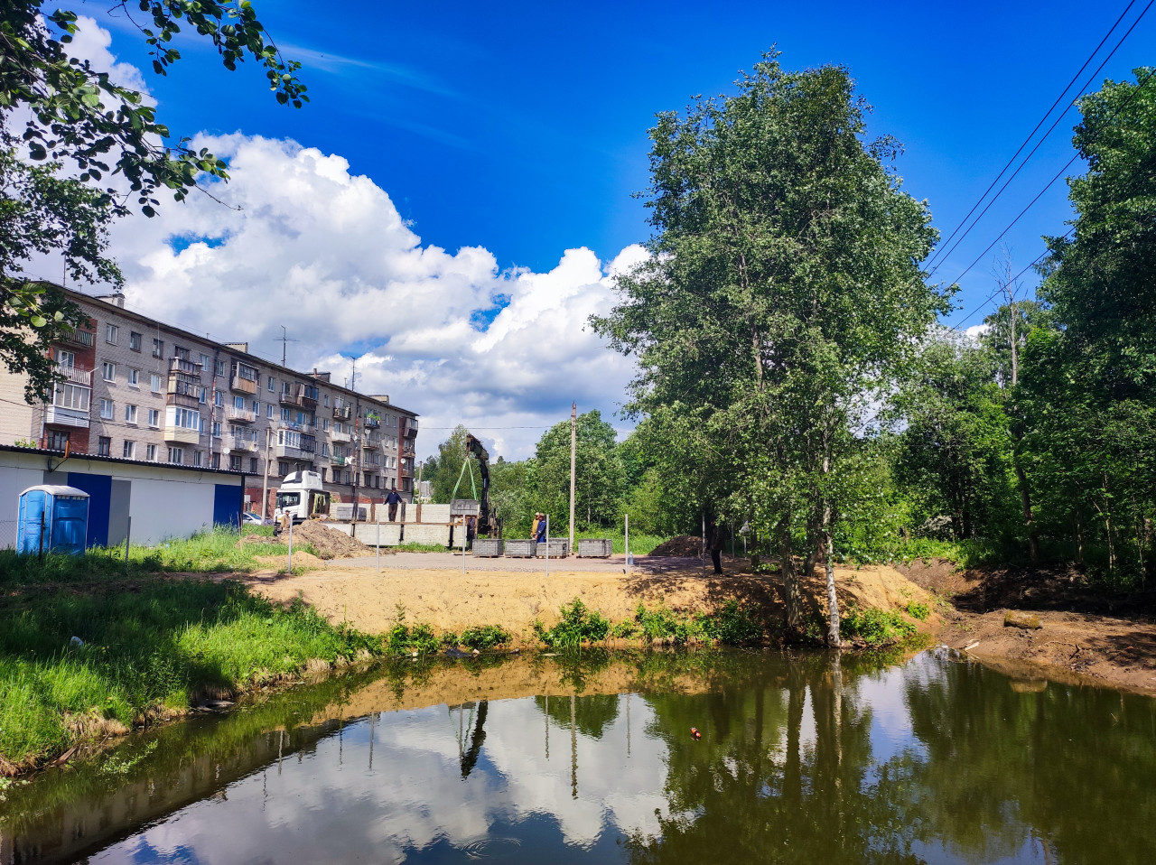 городской пейзаж городские улицы дороги дома улица городская среда город городской вид городская улица городская инфраструктура городской ландшафт урбанистика городская атмосфера уличное пространство городской водоём пруд берег откос отражение в воде облака лето зелёные деревья жилой район пятиэтажный дом стройплощадка благоустройство ремонт территории разгрузка грузовик кран манипулятор поддоны бетонные блоки тротуарная плитка рабочие временное строение переносной туалет линии электропередачи разметка песчаная насыпь укрепление берегаПохожие фотографии