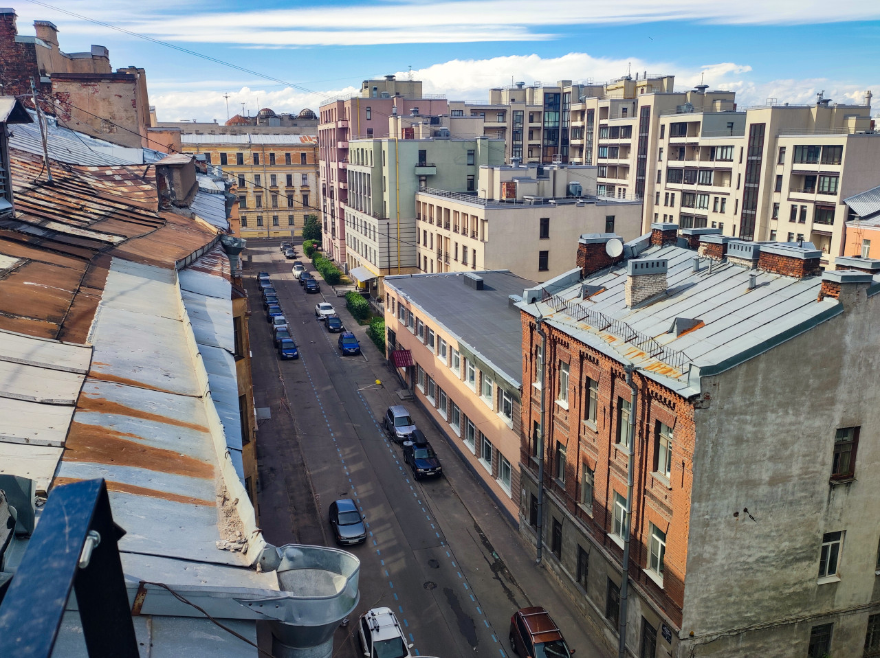 На фотографии вид с высоты на узкую улицу между кварталами: вдоль проезжей части стоят припаркованные легковые автомобили, видна дорожная разметка и перспектива улицы вглубь. По краям кадра проходят скатные металлические крыши с элементами водостока и примыканиями. На горизонте заметны фасады жилых и административных зданий разной этажности, включая современные корпуса с большими окнами. Небо с облаками формирует верхний фон кадра. Фото подходит для иллюстрации тем о городской среде, архитектуре кварталов и панорамных видах.