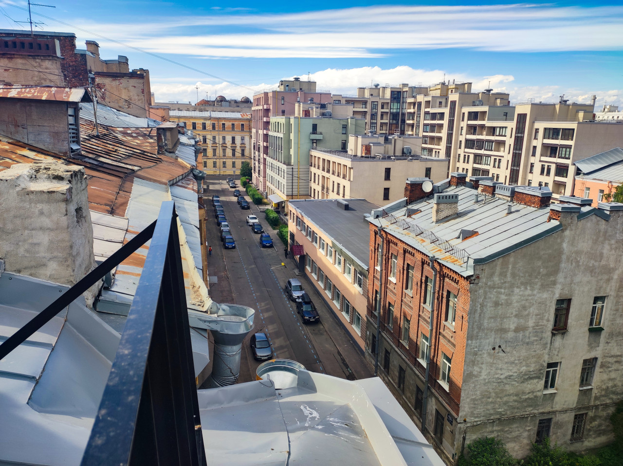 Городской пейзаж, снятый с крыши: узкая улица уходит вдоль квартала, по обеим сторонам припаркованы автомобили. В кадре сочетаются старые корпуса с кирпичными стенами и двускатными металлическими крышами, а также современные многоэтажные здания с большими окнами. На переднем плане видны элементы кровли и ограждение, по крышам проходят дымоходы и коммуникации. Небо яркое, с протяжёнными облачными полосами. Подходит для иллюстраций о городской среде, архитектуре кварталов, недвижимости и видах с крыш.