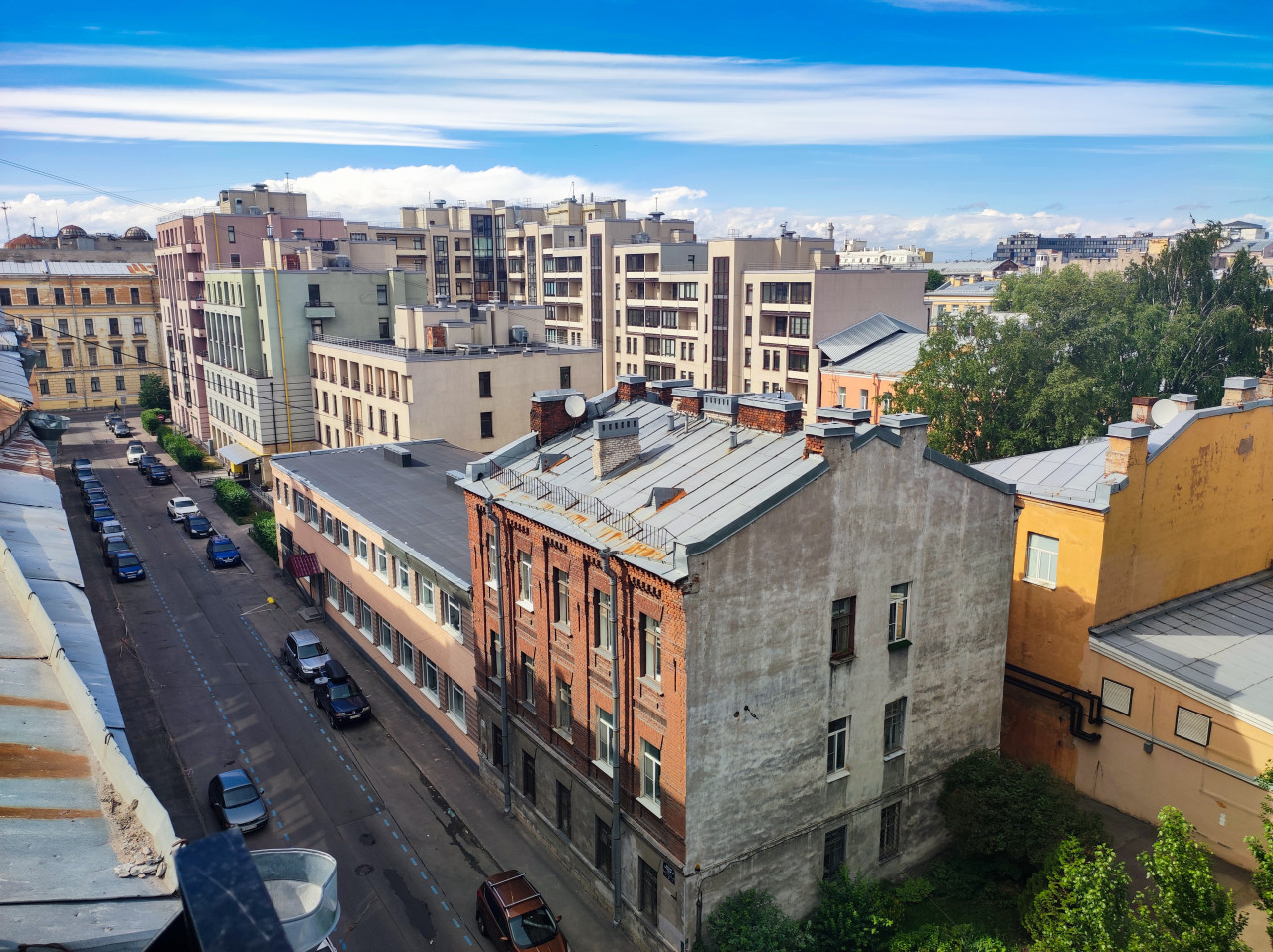 Панорамный вид с крыши на квартал: внизу проходит улица с припаркованными машинами, в центре — кирпичное здание с серой металлической крышей, трубами и небольшими спутниковыми антеннами. Справа видны фасады окрашенных домов и зелёные кроны деревьев во дворе, на дальнем плане — современные многоэтажные жилые корпуса. Небо яркое с длинными облачными полосами. Подходит для материалов о городской среде, архитектуре, недвижимости, а также для иллюстраций к статьям о жизни в центре города и обзорах районов.