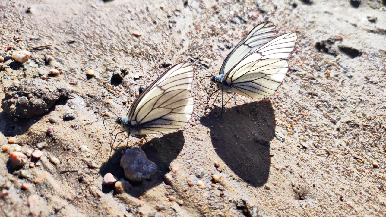 природа насекомые животный мир растения дикая природа биология энтомология биоразнообразие бабочки макро крупный план лето дневной свет солнечные блики белые бабочки пара бабочек прожилки на крыльях усики лапки тень от крыльев песок мокрый песок галька камешки сырой участок лужица обочина дороги природная тропа полевые наблюдения учебная иллюстрация дикая фаунаПохожие фотографии
