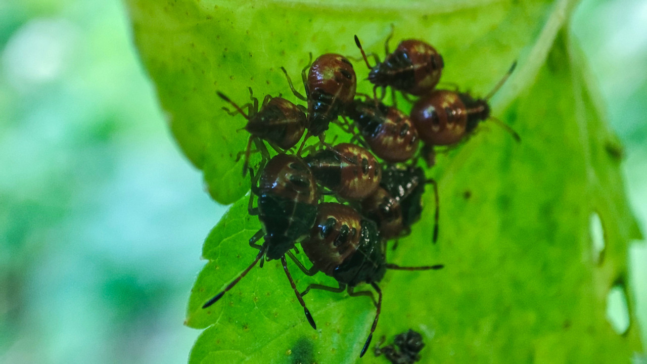 природа насекомые животный мир растения дикая природа биология энтомология биоразнообразие сад крыжовник лист крыжовника листва макросъемка крупный план клопы клопы щитники нимфы клопов колония скопление насекомых полужесткокрылые вредители сада повреждение листьев питание соками растений микромир защита растений мониторинг вредителей уход за кустарниками лето июнь 2024 зеленый фонПохожие фотографии