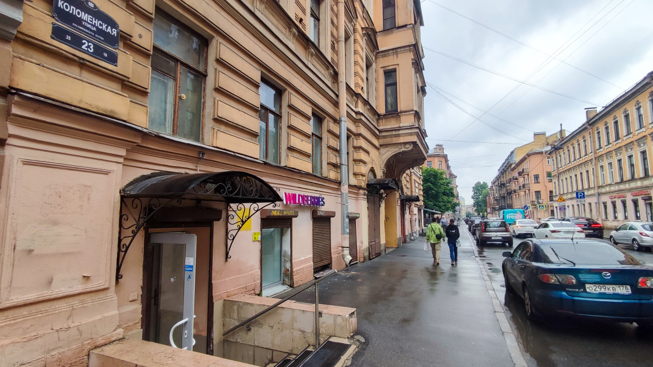 городской пейзаж городские улицы дороги дома улица городская среда город городской вид городская улица городская инфраструктура городской ландшафт урбанистика городская атмосфера уличное пространство Санкт Петербург Коломенская улица уличная табличка адресный знак историческая застройка жилой дом фасад штукатурка окна цокольный этаж вход в подвал козырек кованый навес магазин пункт выдачи Wildberries тротуар мокрый асфальт парковка автомобили пешеходы пасмурная погода провода перспектива улицы повседневная жизньПохожие фотографии
