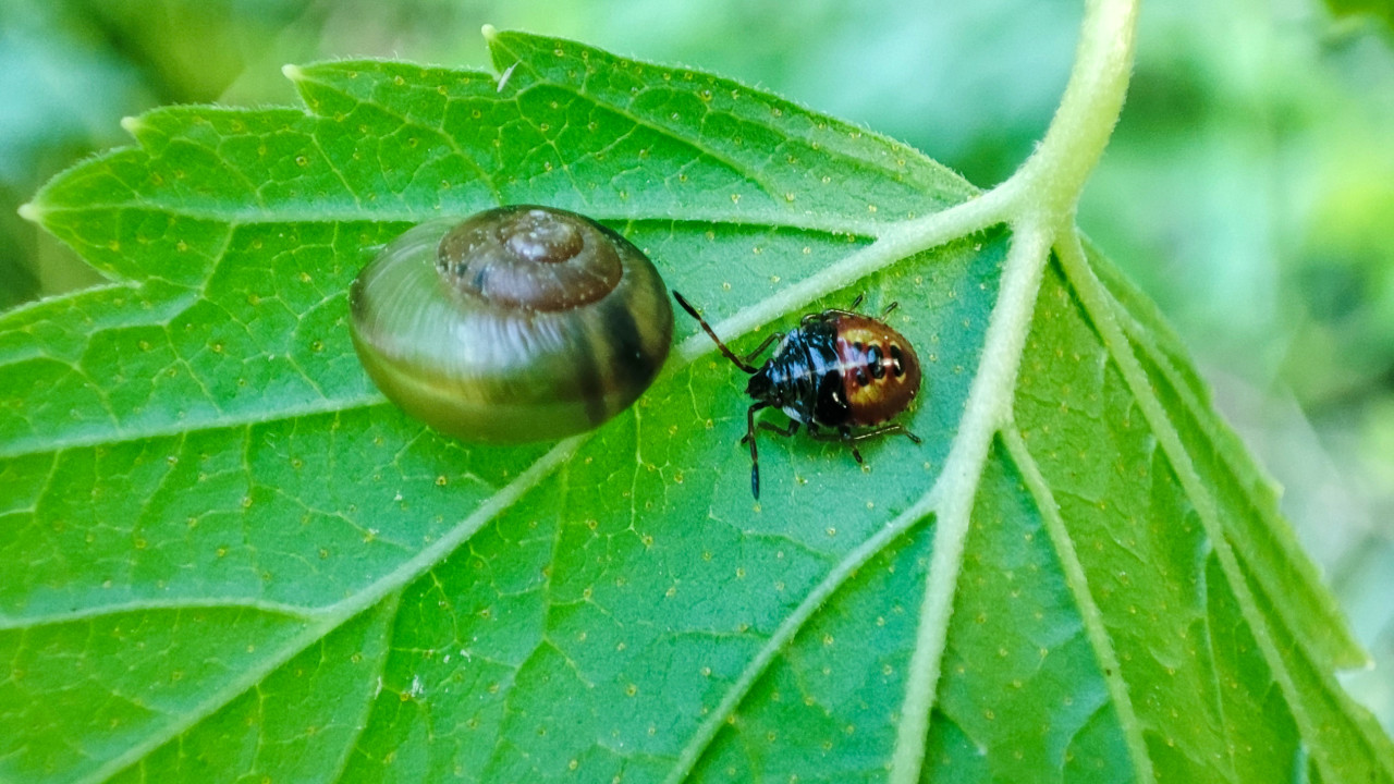 Макросъёмка, июнь 2024: на зелёном листе кустарника видна небольшая улитка с коричнево-оливковой раковиной и рядом насекомое с округлым брюшком и длинными усиками, характерное для нимф клопов-щитников. В кадре читается рисунок жилкования, мелкие точки на поверхности листа и пушистый черешок. Фон размыт, создаёт естественное зелёное окружение. Фото подходит для материалов о насекомых и моллюсках, биоразнообразии, вредителях сада и макросъёмке природы.