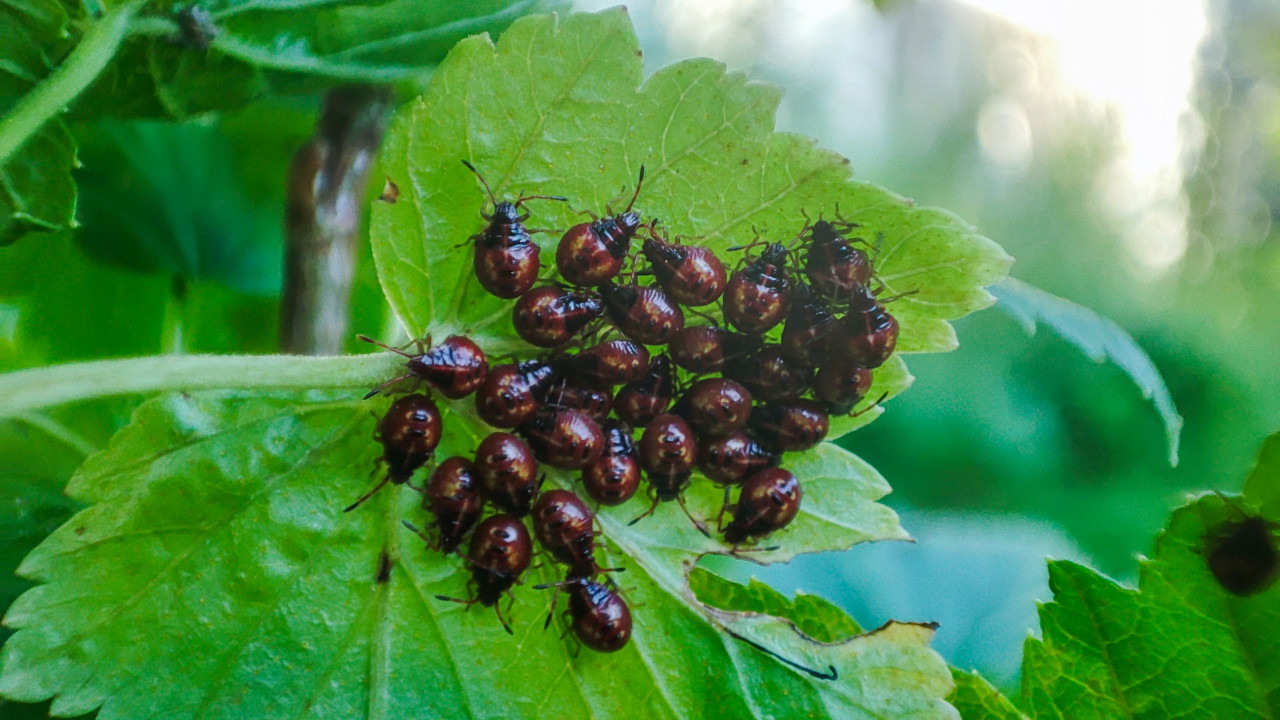Большая группа нимф клопов-щитников на листе кустарника на фоне зелёной растительности
