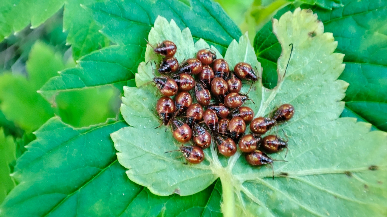 Макросъёмка, июнь 2024: на светлом листе кустарника сидит плотная группа нимф клопов-щитников с округлыми красновато-коричневыми телами и тёмными участками на спинке. Часть особей расположена по краям, видны усики и лапки, вокруг листа заметны мелкие частицы и точечные следы на поверхности. На заднем плане находятся более тёмные листья, формирующие контрастный зелёный фон. Фото подходит для иллюстраций о жизненных стадиях клопов, вредителях растений, макрофотографии и сезонных наблюдениях.