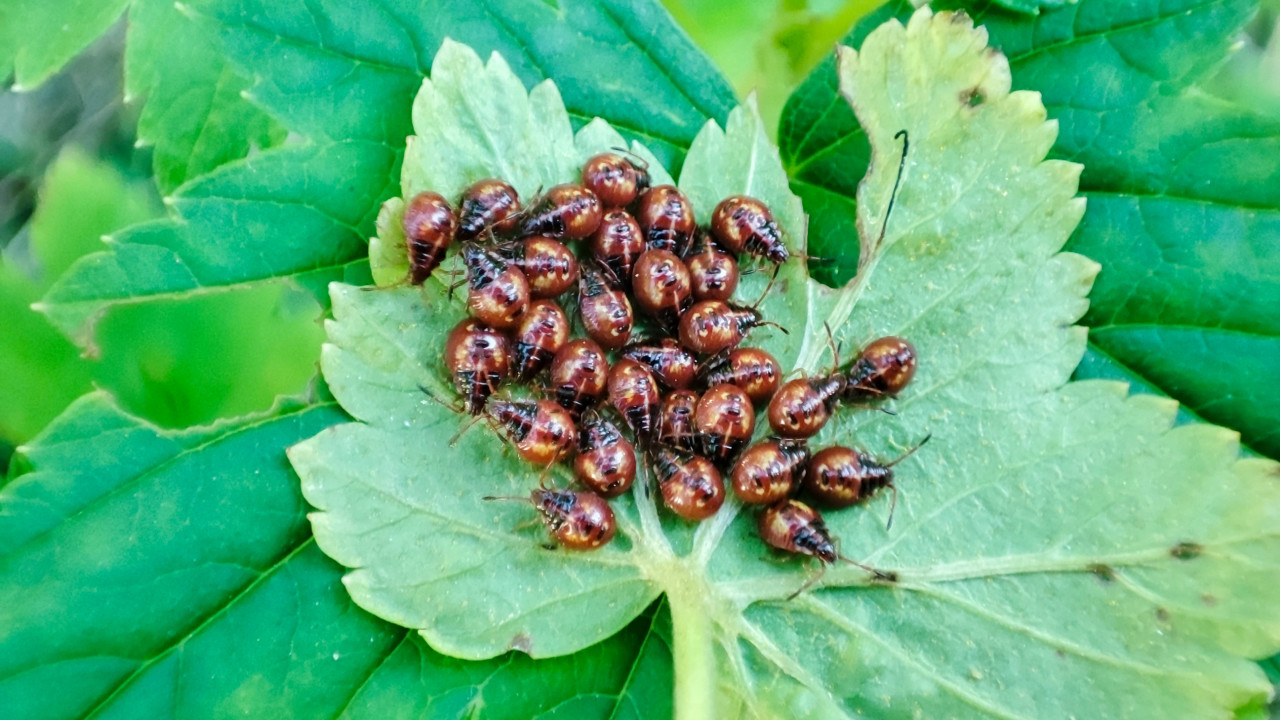 Скопление нимф клопов на зелёном листе растения крупным планом