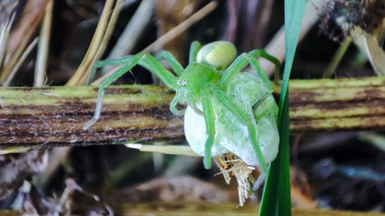 Зелёный паук-охотник на горизонтальном стебле удерживает кокон с добычей среди сухой травы