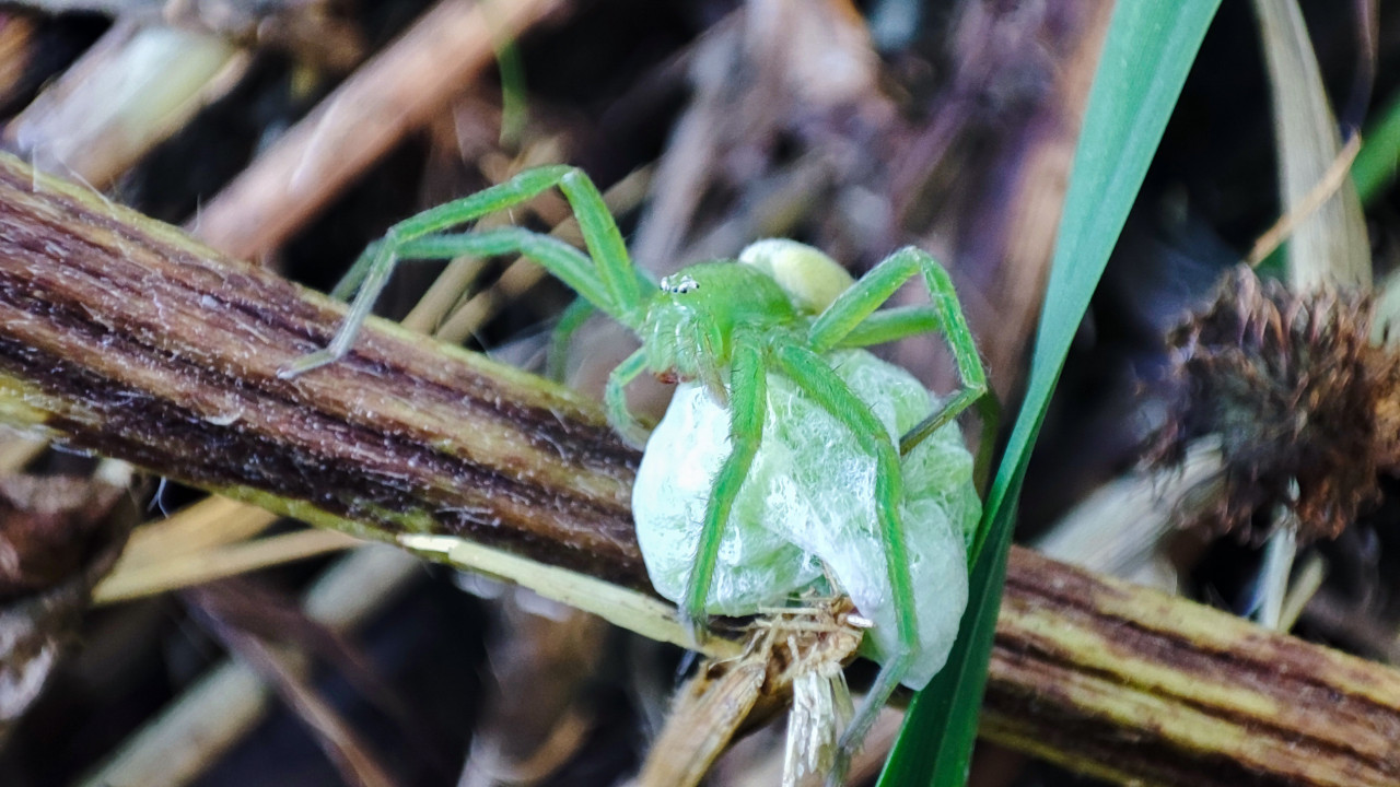 природа насекомые животный мир растения дикая природа биология энтомология биоразнообразие макро крупный план паук паукообразные зелёный паук паук охотник микроммата охота хищник добыча паутина кокон свёрток упаковка добычи нити паутины насекомое питание поведение зоология экология экосистема травяной ярус сухая трава стебель лето наблюдениеПохожие фотографии