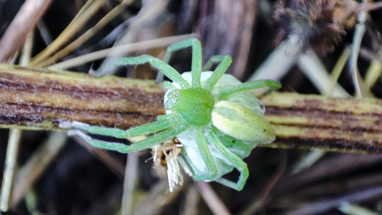 Зелёный паук-охотник удерживает белый кокон среди сухих стеблей и листьев