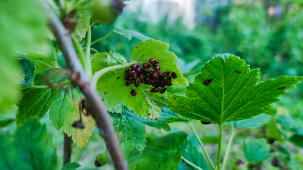 Снято на открытом воздухе в июне 2024 года: в центре кадра лист кустарника, на котором заметно скопление мелких насекомых с округлыми телами и длинными усиками, характерных для нимф клопов-щитников. Вокруг видны другие листья, стебли и ветка, фон размытый, создаёт ощущение густой зелёной растительности. По листовой пластинке читаются пятна и мелкие следы повреждений, часть насекомых расположена по краям. Фото подходит для иллюстраций о жизни насекомых на растениях, вредителях и природных наблюдениях.