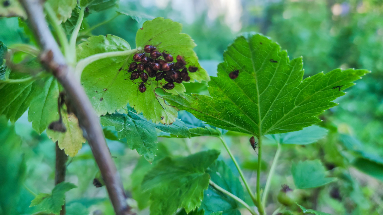 Июнь 2024, съёмка на природе: на листе кустарника собралась группа нимф клопов-щитников, рядом на соседнем крупном листе видна одиночная особь, ещё одна расположена ниже на черешке. В кадре читается структура листьев, их края и прожилки, на некоторых участках заметны мелкие дефекты и пятна. Фон размытый, с зелёными оттенками растительности. Фото подходит для материалов о распространении насекомых на растениях, мониторинге вредителей, энтомологии и защите садовых культур.