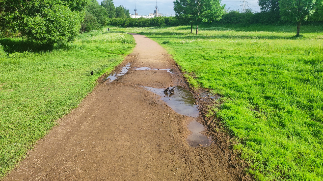 На фотографии показана грунтовая пешеходная дорожка в парковой зоне. На поверхности видны лужи и мокрые участки, а по краям дорожки растёт яркая зелёная трава. В правой луже купаются две птицы, ещё одна птица стоит на газоне слева. Дорожка уходит вдаль и поворачивает среди кустов и отдельных деревьев, на горизонте заметны технические сооружения и линии электропередачи. Свет солнечный после дождя, тени мягкие. Фото можно использовать для материалов о городской природе, прогулках, погоде и сезонной влажности почвы.
