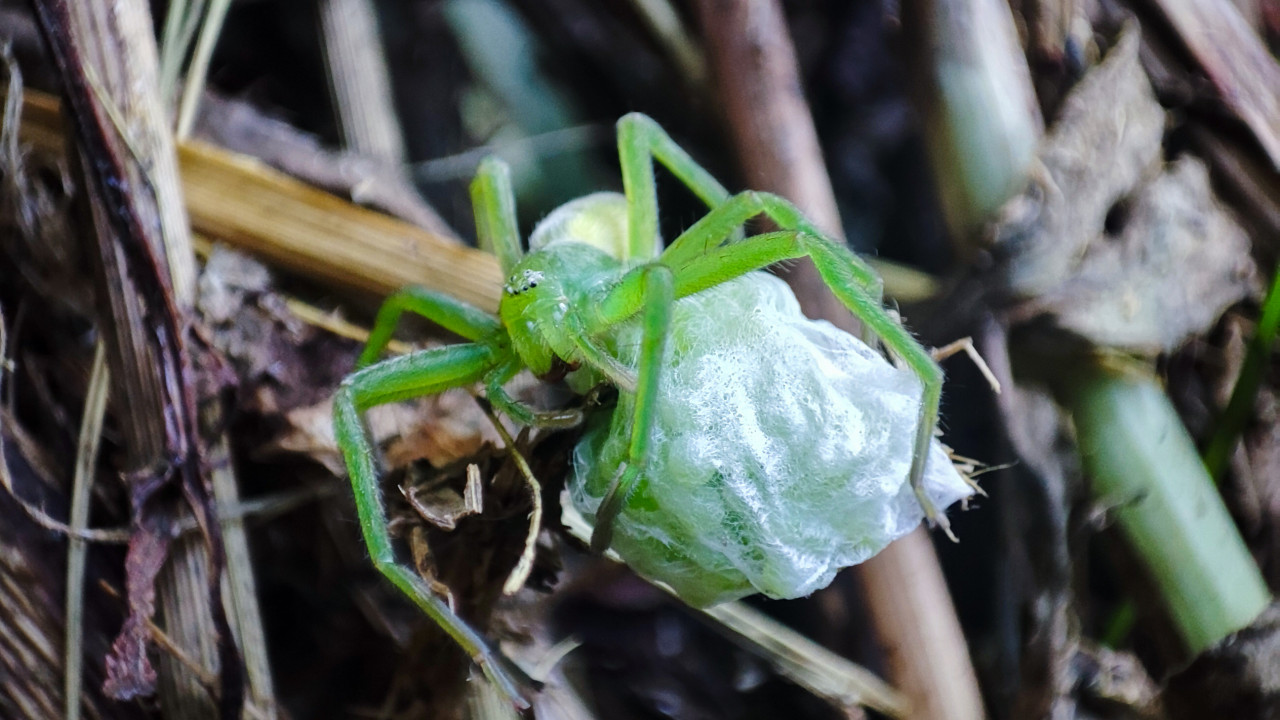 Детальная макросъёмка зелёного паука-охотника среди сухих стеблей: голова и передние лапки находятся в резкости, на лапках заметны тонкие волоски. Под телом расположен белый яйцевой кокон из шелка, на поверхности видна волокнистая структура и неровные «слои» нити. Фон состоит из соломинок и тёмных участков подстилки, часть элементов пересекает кадр диагонально и размыта. Снимок можно использовать для учебных материалов по биологии, экологическим заметкам и иллюстраций о микромире.