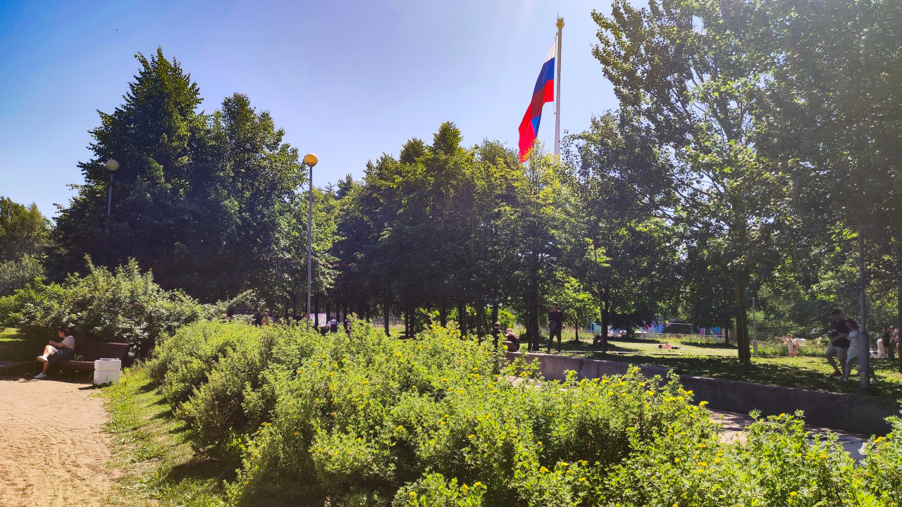 город парк зелёная зона деревья газон лето прогулка отдых люди городская среда благоустройство общественное пространство кустарники лужайка лавочка дорожка песчаная дорожка фонарь флагшток флаг российский флаг символика солнечный день дневной свет тени озеленение люди в парке Россия природа в городеПохожие фотографии