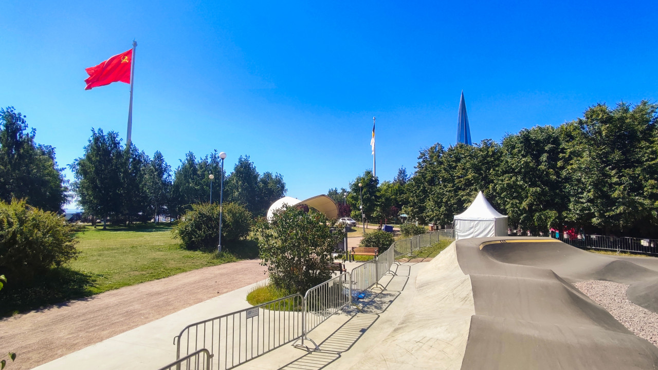 Памп-трек в парке с флагом СССР на флагштоке и видом на Лахта Центр
