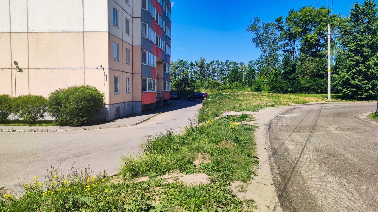 Проезд у торца многоэтажного дома рядом с пустырем и лесополосой