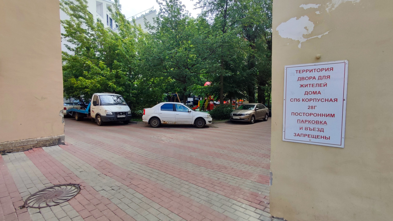Снимок сделан в проезде между зданиями: виден въезд во двор с мощением тротуарной плиткой, припаркованные машины и эвакуатор на базе «Газель». Справа на стене размещена табличка о том, что территория двора предназначена для жителей (СПб, Корпусная 28Г) и посторонним въезд и парковка запрещены; сверху заметны участки облупившейся штукатурки. На заднем плане густые деревья и детская площадка. Дневное освещение, летняя зелень. Фото подойдет для тем о дворовой логистике, ограничениях доступа, эвакуации авто и городском благоустройстве.