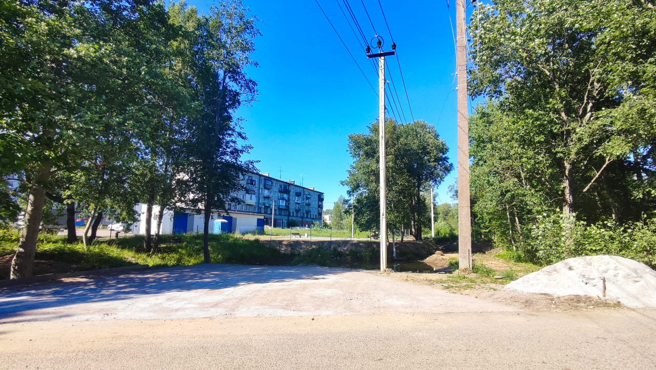 Июнь 2024: на фото край асфальтированной дороги и примыкание к светлой отсыпанной площадке из песка или щебёночной смеси, подготовленной под ремонт покрытия. В кадре стоят железобетонные опоры с воздушными линиями электропередачи, вдоль обочины растут деревья и кустарник. Справа лежит куча инертного материала, рядом заметны следы техники и срезанный грунт. На заднем плане виден многоэтажный жилой дом и хозяйственные постройки. Снимок подходит для иллюстраций о дорожных работах и городской инфраструктуре.