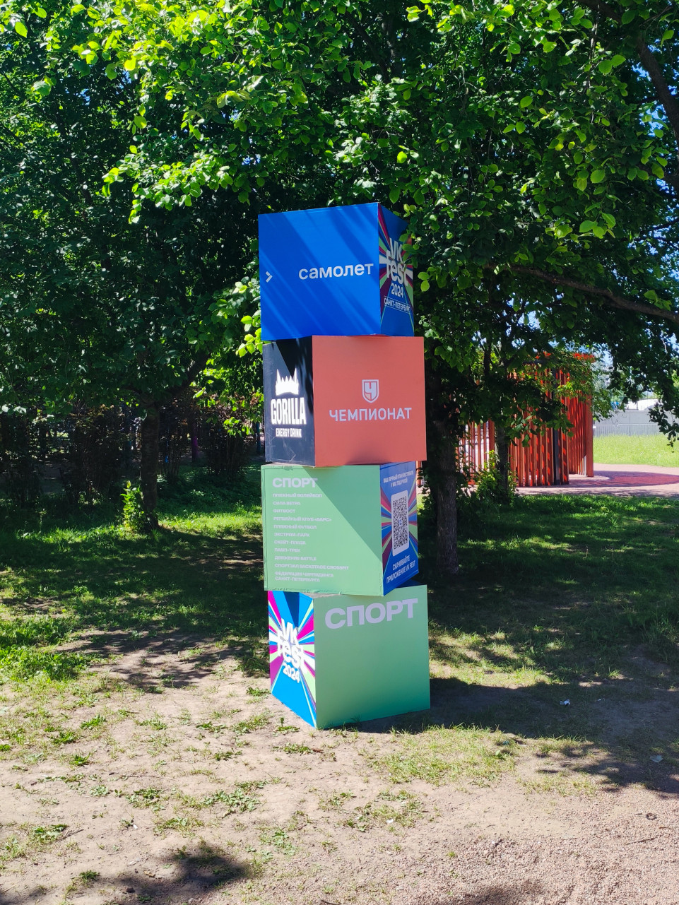 Вертикальный кадр в тени деревьев: на грунте стоит высокая стела из кубов с графикой VK Fest 2024 и надписями «самолет», Gorilla energy drink и «чемпионат». На зелёном блоке размещён список спортивных активностей и QR-код, сбоку читается «Санкт-Петербург». На фоне видны ограждения и красная конструкция, вокруг трава и пятна солнечного света. Фото подходит для новостей о спонсорстве и партнёрстве, материалов о фестивальном брендинге, городской навигации и рекламе на мероприятиях.