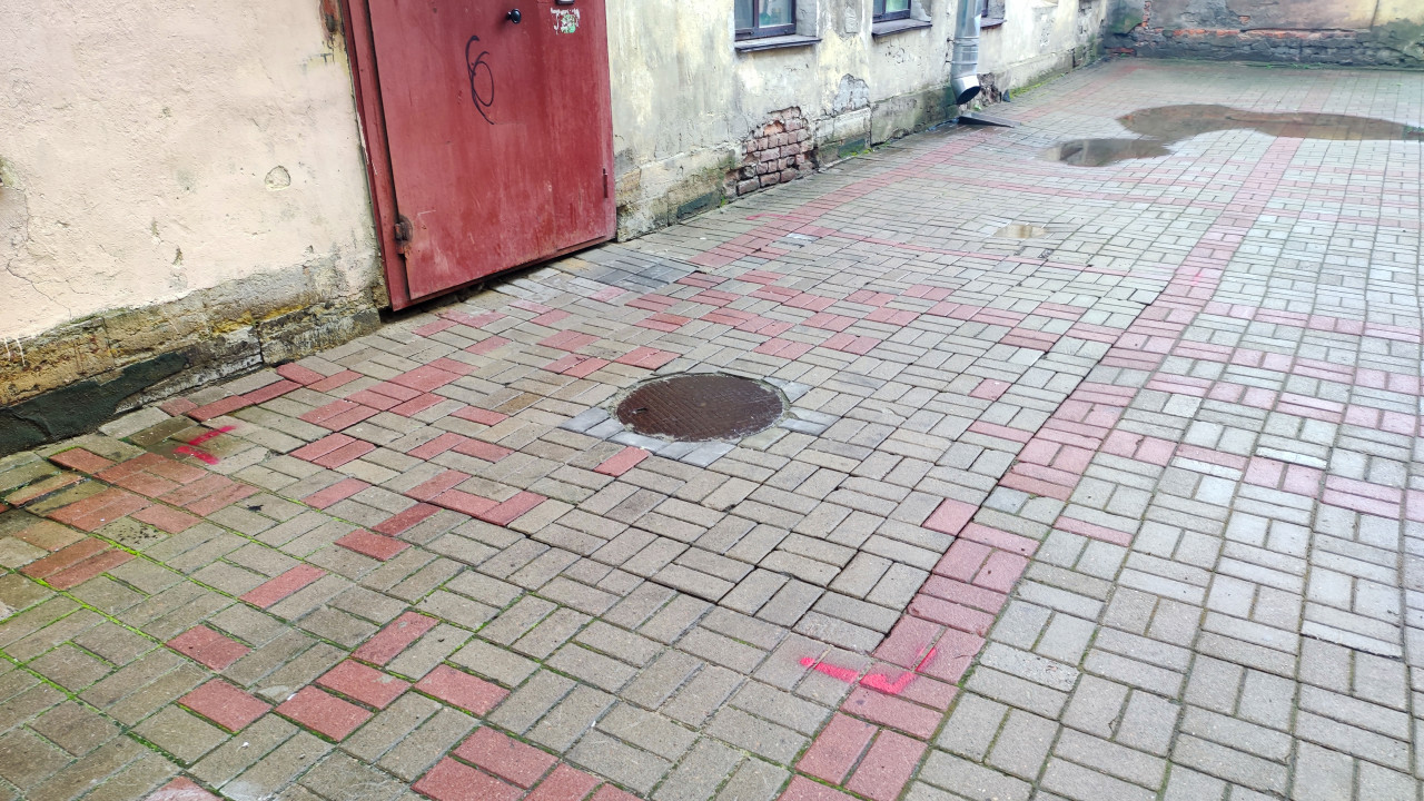придомовая территория двор дворовая территория двор жилого дома жилой двор жилой квартал спальный район городской двор городская среда благоустройство территория около дома город Санкт Петербург тротуарная плитка мощение рисунок укладки люк канализационный люк лужи мокрая поверхность красная металлическая дверь служебная дверь штукатурка разрушенная штукатурка оголенный кирпич сырость плесень водосточная труба отвод воды старый дом двор колодец коммунальные коммуникации технический вход граффити ремонт текстураПохожие фотографии