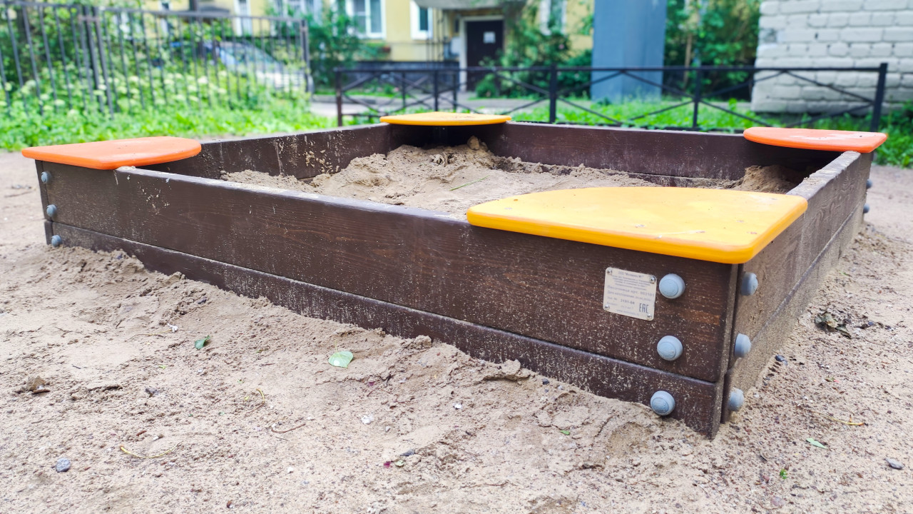 благоустройство детская площадка детские развлечения детский отдых детский досуг детское оборудование игровая зона игровое оборудование игровая площадка игровой комплекс развлечение физическая активность песочница крупный план деревянная конструкция песок сиденье пластиковые элементы болты крепеж паспорт изделия табличка эксплуатация износ уход безопасность двор жилой дом ограждение городская среда инвентаризация муниципальное имущество дети игры песчаное покрытие детская инфраструктура контроль качестваПохожие фотографии