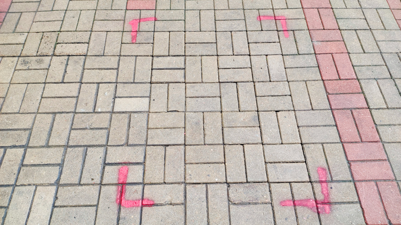 придомовая территория двор дворовая территория двор жилого дома жилой двор жилой квартал спальный район городской двор городская среда благоустройство территория около дома тротуарная плитка брусчатка мощение узор укладки красная плитка серый бетон разметка аэрозольная краска отметки на покрытии строительная разметка геодезия подготовка работ ремонт покрытия текстура фон поверхность крупный план абстракция минимализм линии прямоугольники швы стыки износ грязь уличное покрытиеПохожие фотографии