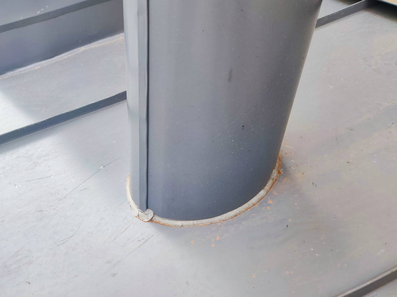 Крупный план основания металлической трубы на крыше: виден круговой фартук и слой герметизации по контуру, вокруг — ровная поверхность кровельного металла с царапинами и следами эксплуатации. По краю уплотнения заметны рыжие пятна коррозии и загрязнения, рядом проходит фальцевый шов панели. Снимок показывает узел прохода трубы через кровлю и качество уплотнения вблизи. Подходит для материалов о гидроизоляции, ремонте крыш, техническом контроле, эксплуатации инженерных выводов и обучающих пособий по кровельным работам.