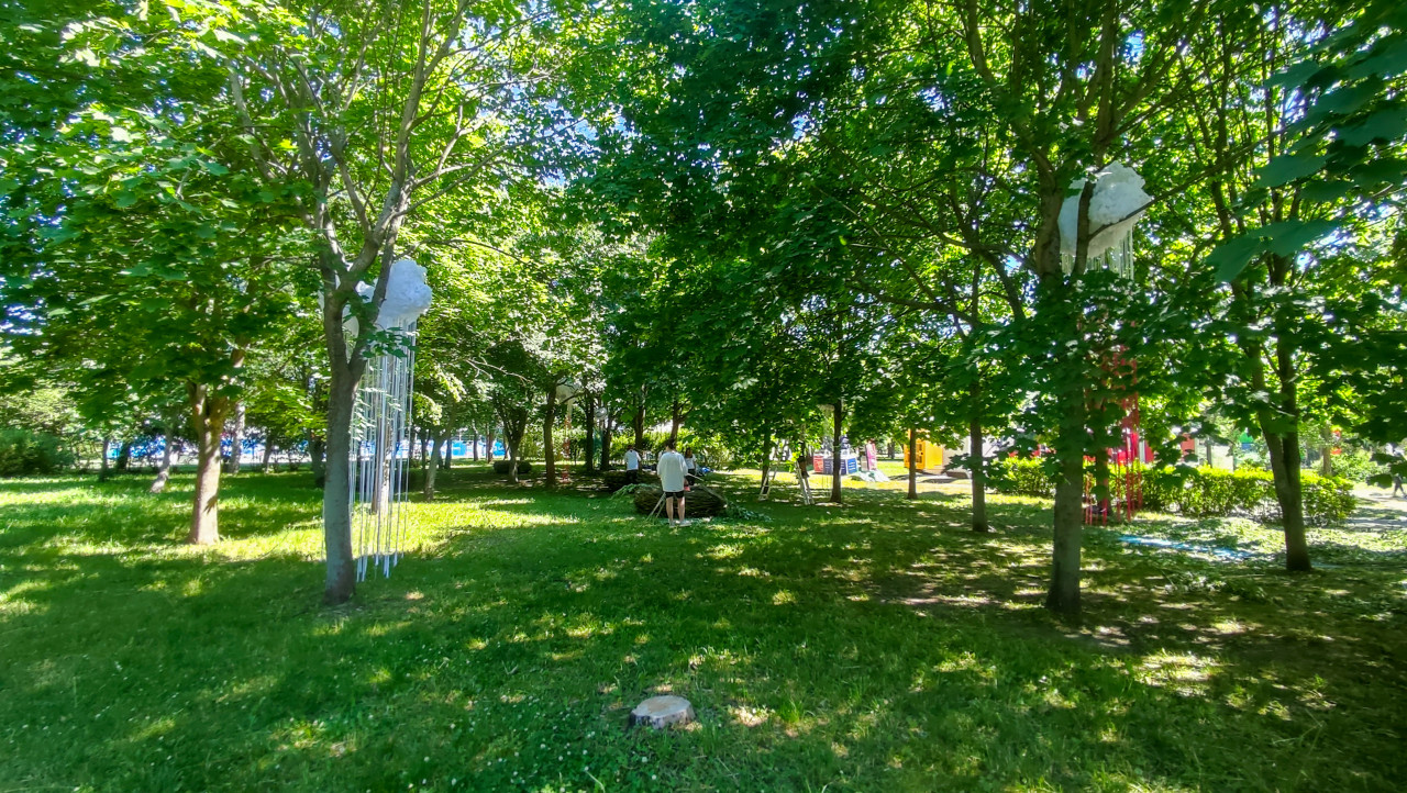 Тенистая поляна в городском парке с подвесными арт-объектами на деревьях и рабочими на газоне
