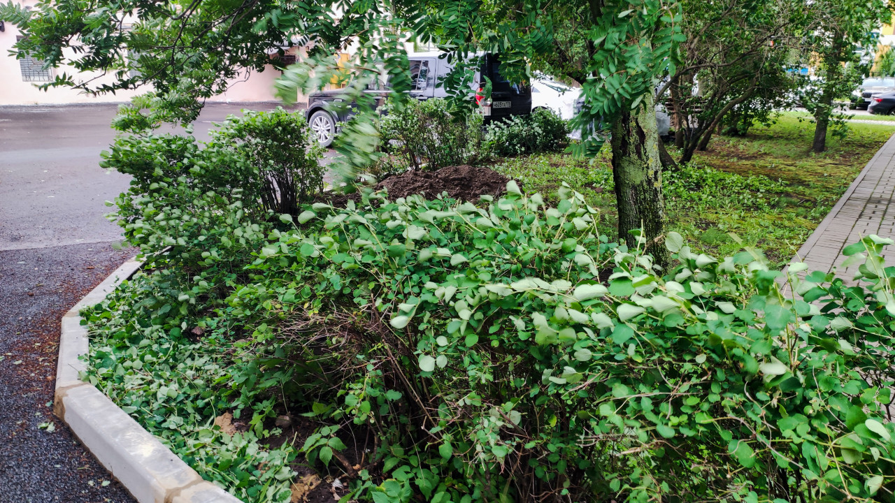 придомовая территория двор дворовая территория двор жилого дома жилой двор жилой квартал спальный район городской двор городская среда благоустройство территория около дома город озеленение зеленая зона кустарник кусты деревья санитарная обрезка обрезанные ветки листья садовые работы уход за насаждениями бордюр поребрик почва земля газон парковка припаркованные машины асфальт пешеходная дорожка тротуарная плитка лето пасмурно коммунальные работы благоустройство двораПохожие фотографии