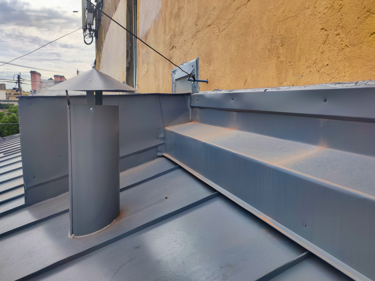 крыша кровля металлическая кровля фальцевая кровля ремонт кровли примыкание к стене металлические листы планка примыкания герметик гидроизоляция узел кровли крепёж саморезы короб вентиляционный вывод вентиляционная труба защитный зонт кабель крепление кабеля фасад монтаж строительные детали техобслуживание эксплуатация здания инженерные коммуникации безопасность крупный план городская архитектураПохожие фотографии