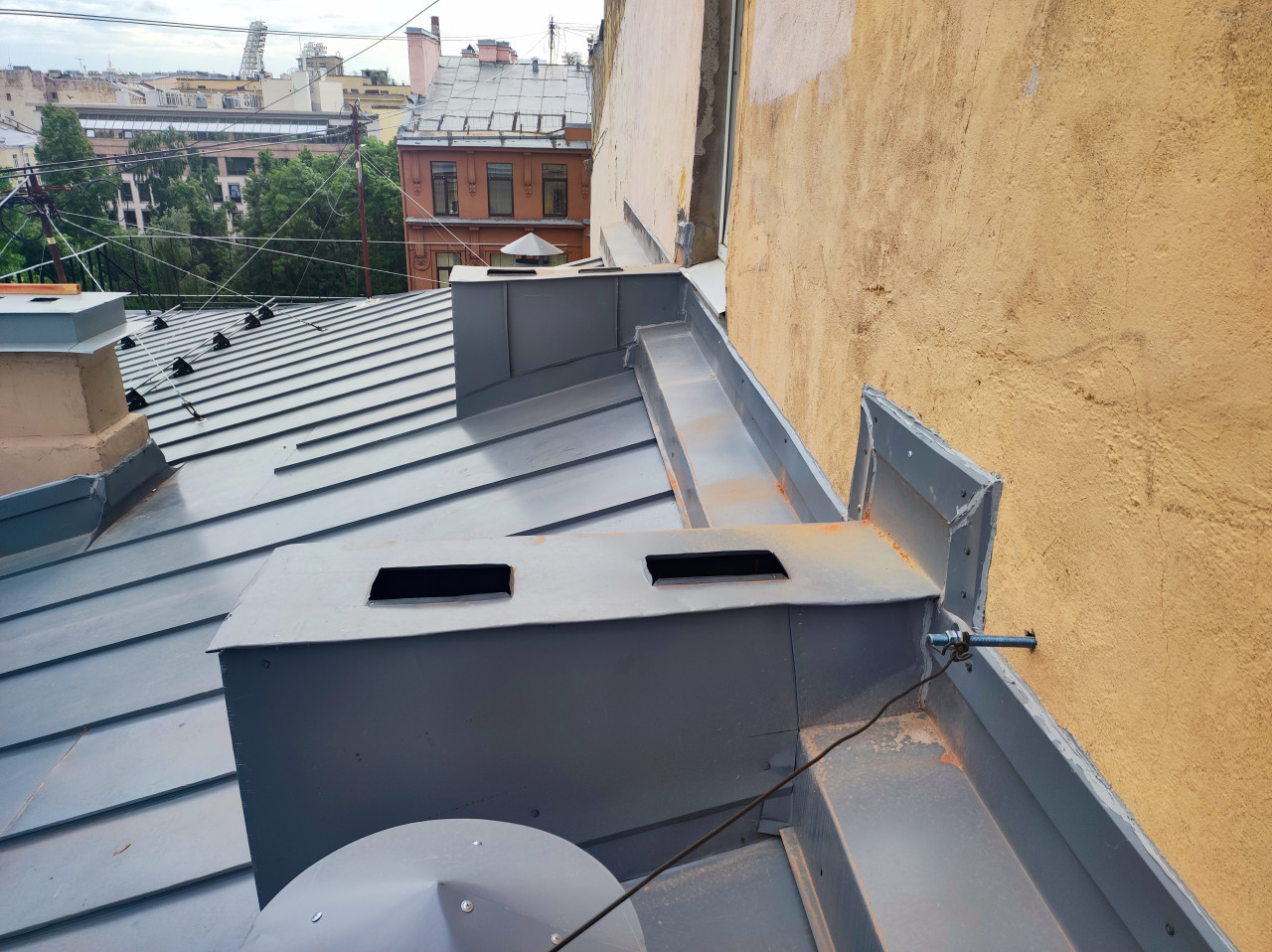крыша кровля металлическая кровля фальцевая кровля ремонт кровли фальцевые панели металл вентиляционные короба воздуховод вытяжка инженерные системы коммуникации кабель провод крепление к стене фасадная стена примыкание герметизация ремонт реконструкция обслуживание зданий ЖКХ городской двор деревья жилые дома архитектура вид сверху техническая зона кровельные работы безопасность на крыше инфраструктураПохожие фотографии