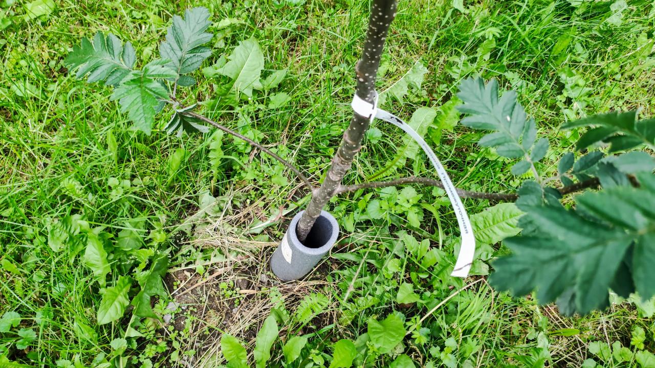 Крупный план молодого деревца на газоне: у основания установлен защитный цилиндр, ствол перетянут белой лентой с биркой, вокруг заметны листья и полевые травы. Видно место посадки и небольшое оголение почвы рядом с зелёным ковром. Снимок сделан днём в тёплый сезон, без людей и лишних деталей, акцент на элементах ухода и маркировки посадок. Фото можно использовать для материалов о городском озеленении, защите молодых деревьев, садоводстве, экологии и благоустройстве. Уместно для методичек по уходу за посадками и публикаций о защите саженцев.