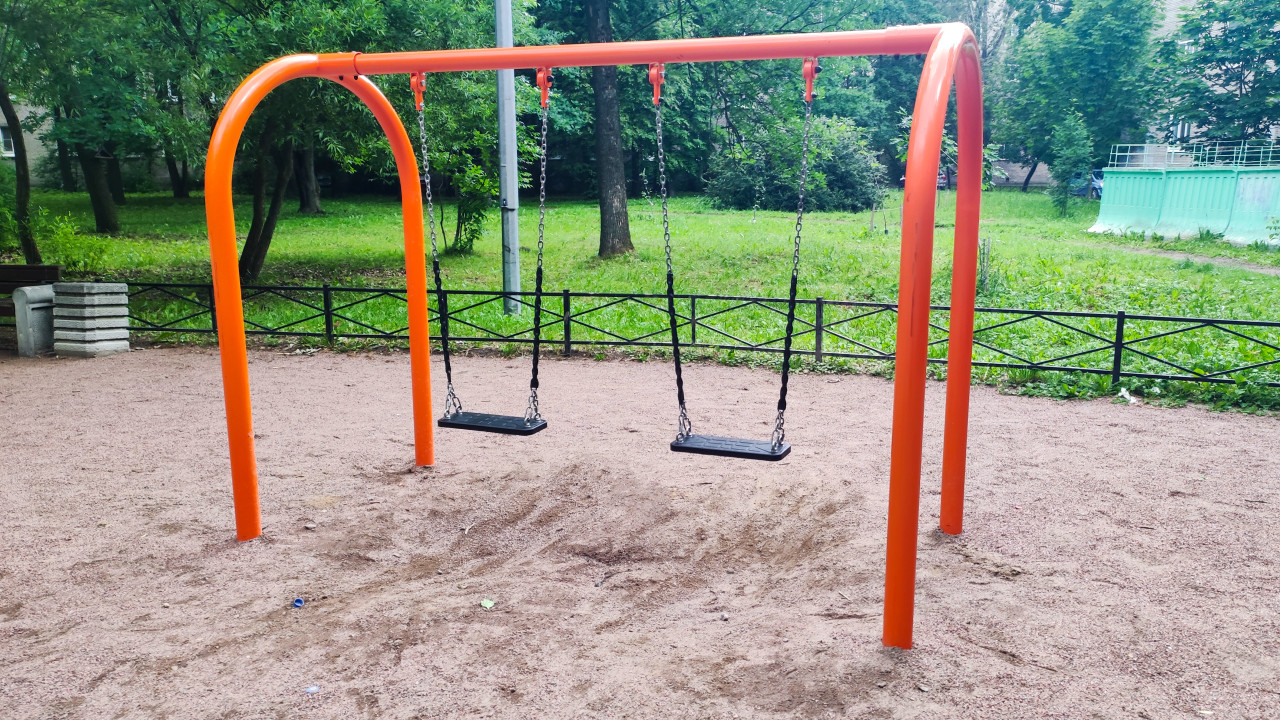 Оранжевые дворовые качели с двумя сиденьями на песчаной площадке