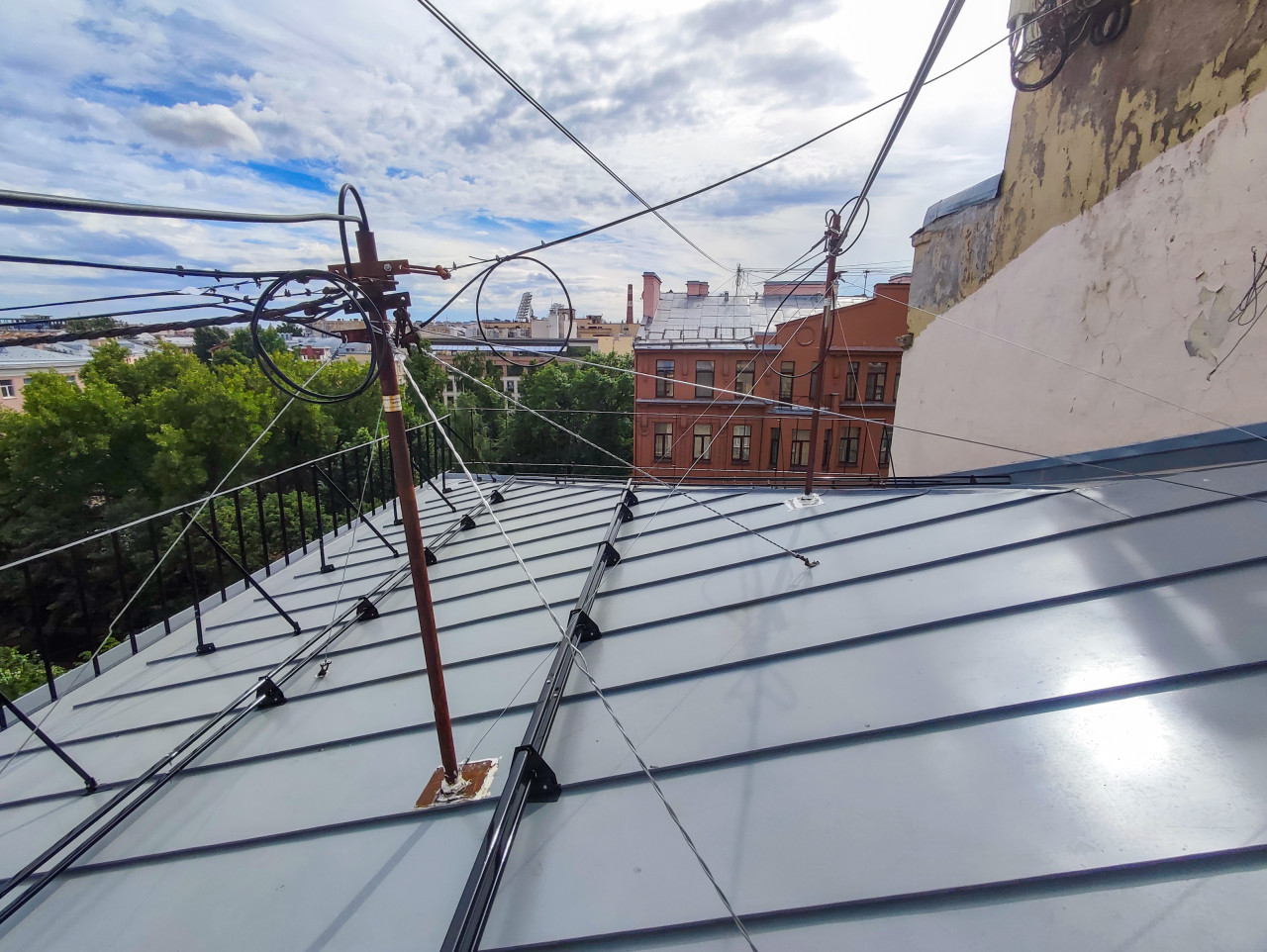 крыша кровля металлическая кровля фальцевая кровля ремонт кровли архитектура город кровельные панели снегозадержатели крепления тросы провода кабели инженерные коммуникации молниезащита антенная мачта стойка изоляторы узлы крепления техническое обслуживание ремонт крыши безопасность ограждение крыши городские здания фасад облупившаяся штукатурка зеленые деревья облачное небо перспектива строительные технологии инфраструктура связиПохожие фотографии