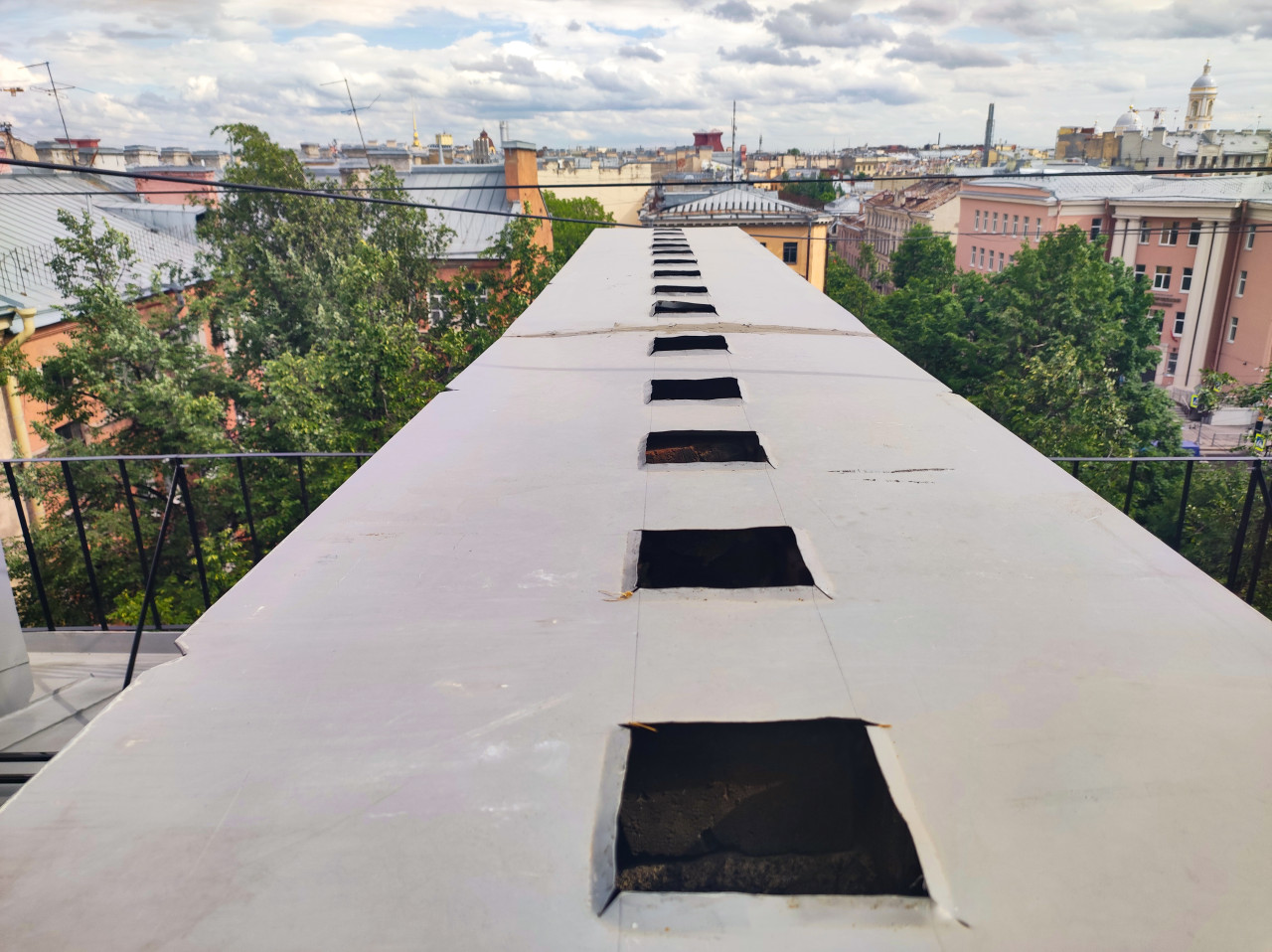 Ряд прямоугольных проёмов на плоской металлической кровле с видом на город