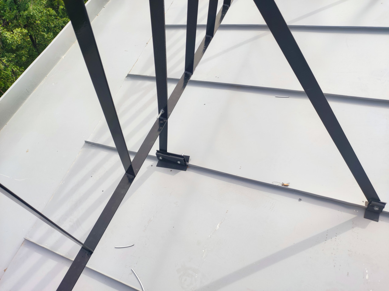 Фрагмент металлической кровли с рёбрами профиля и чёрной металлической рамой, закреплённой на кронштейнах. Видны стойки и диагональные элементы конструкции, прижимные узлы, болты и монтажные площадки на швах листов. На поверхности заметны следы эксплуатации, мелкий мусор и царапины; по краю кадра просматривается зелёная листва деревьев. Снимок подходит для материалов о строительстве и ремонте крыш, монтаже ограждений и металлоконструкций, а также для технических презентаций по кровельным системам.