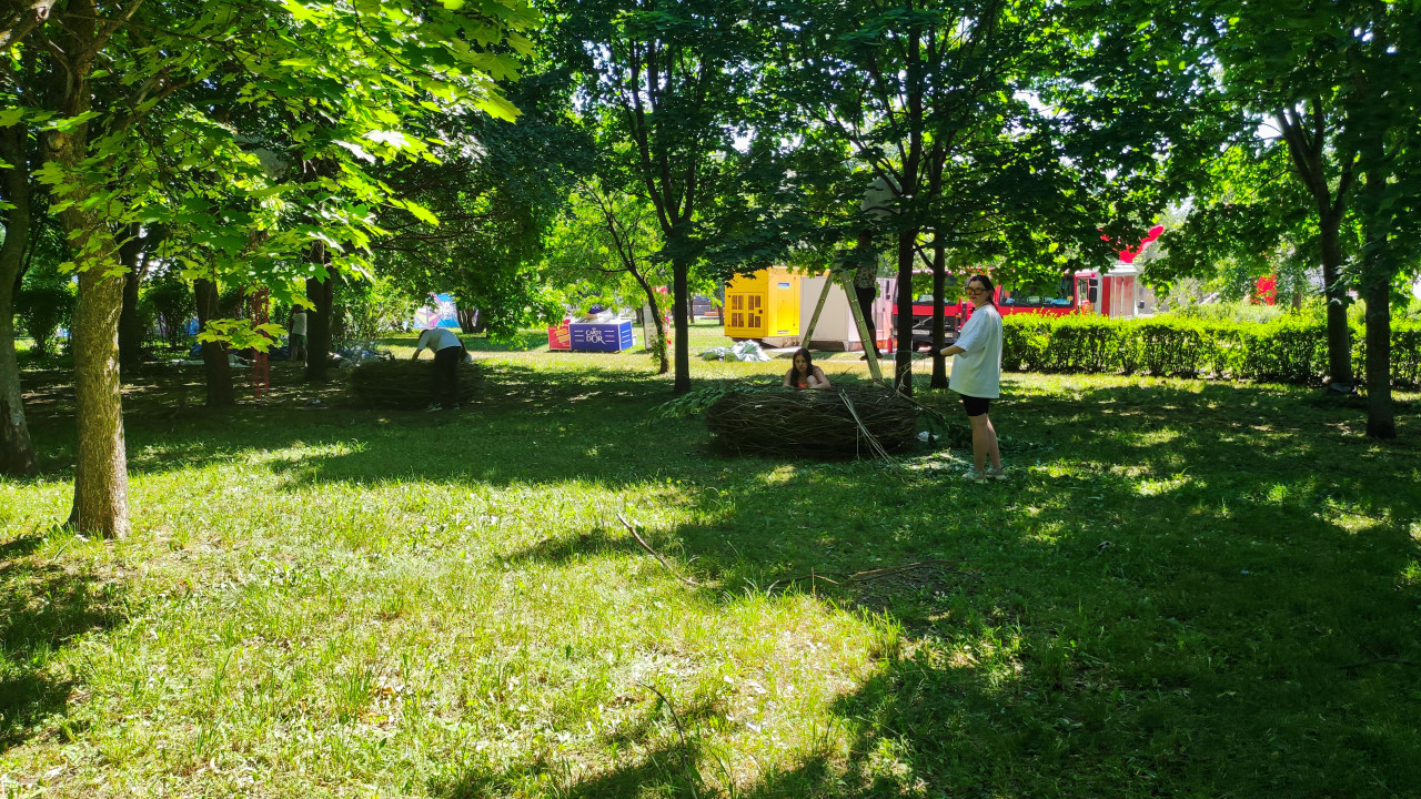 Июнь 2024, Санкт-Петербург: в тенистой части парка на траве лежат связки веток и срезанные побеги, рядом работают несколько человек, один использует приставную лестницу у дерева. На заднем плане видны временные павильоны и фуд-зона, контейнеры и техника, а также рекламный стенд Carte d’Or среди фестивальных конструкций. Сцена снята в период подготовки территории к событию: расстановка объектов, уборка и монтаж элементов. Фото можно использовать в материалах о городских фестивалях, организации мероприятий и работе служб благоустройства.