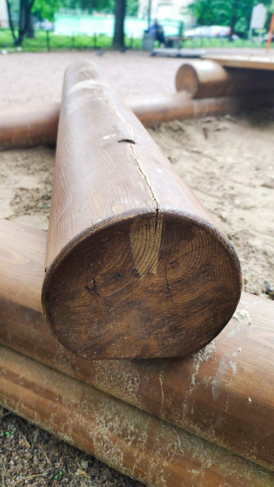 Кадр сфокусирован на торце круглого бревна, лежащего на песке в зоне детской площадки. Хорошо читаются годичные кольца и рисунок древесины; от края к центру проходит трещина, а на поверхности заметны потёртости и песчаные следы. Задний план размытый: угадываются другие элементы ограждения, резиновое покрытие и зелёные деревья во дворе. Съёмка выполнена при дневном свете, с малой глубиной резкости. Фотография подойдёт для материалов о старении древесины, ремонте уличного оборудования и контроле состояния детских площадок.
