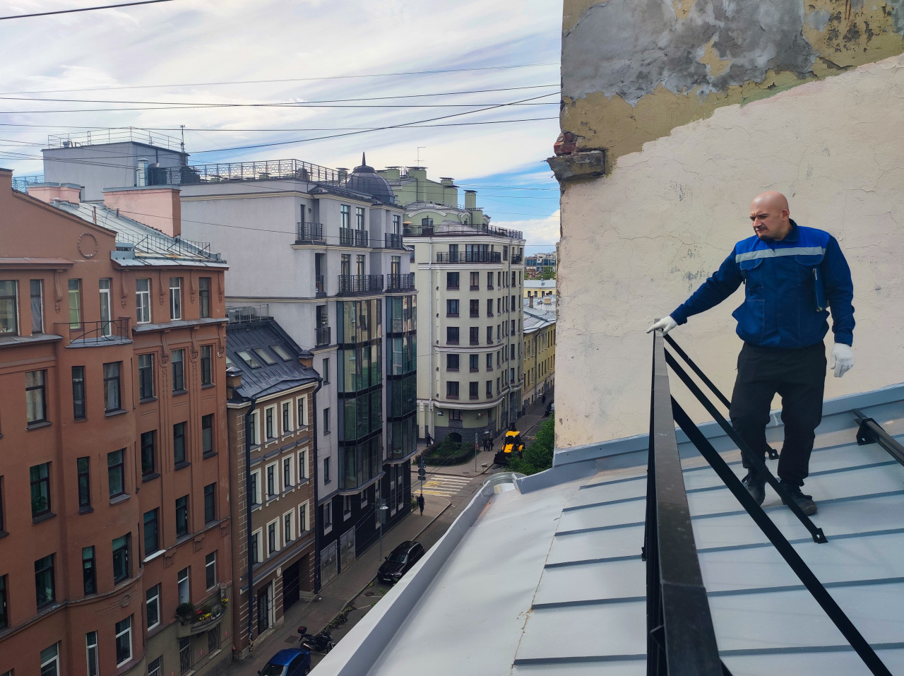крыша кровля металлическая кровля фальцевая кровля ремонт кровли город рабочий на крыше кровельные работы инспекция обслуживание домов безопасность труда поручень ограждение крыши металл скат крыши стена здания штукатурка городской квартал улица перекресток автомобили тротуар фасады окна балконы провода панорамный вид высота дневной свет облакаПохожие фотографии