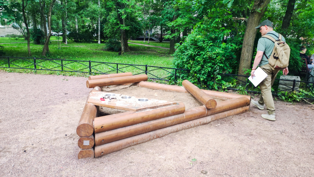 благоустройство детская площадка детские развлечения детский отдых детский досуг детское оборудование игровая зона игровое оборудование игровая площадка игровой комплекс развлечение физическая активность городская среда песочница ремонт площадки обслуживание разборка конструкции деревянные брёвна брус песок следы работ мужчина прохожий рюкзак кепка лист бумаги парк во дворе зелёные насаждения деревья кусты газон металлическое ограждение тропинка лето дневной свет район жилой застройки безопасность детей РоссияПохожие фотографии