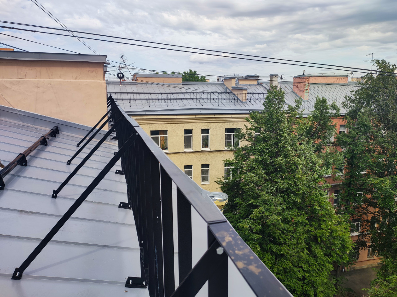 крыша кровля металлическая кровля фальцевая кровля ремонт кровли парапет металлический парапет ограждение крыши перила ребра фальца крепеж инженерные сети воздушные провода линии электропередачи городской двор соседние дома окна фасады скатные крыши антенны дерево зелень городской пейзаж перспектива высота безопасность обслуживание здания пасмурная погода облачное небо архитектураПохожие фотографии