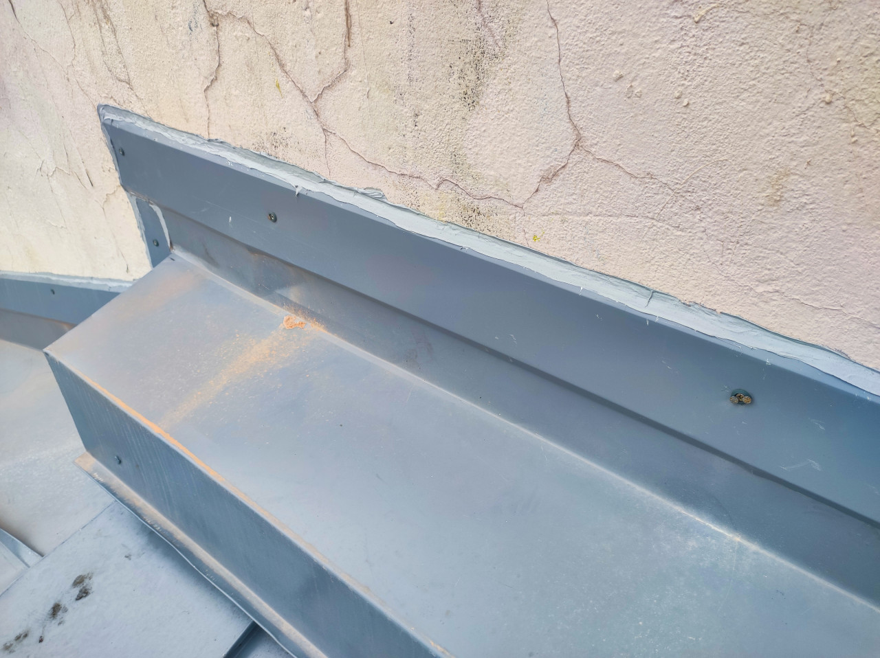 Крупный план узла примыкания фальцевой кровли к стене: серый металлический фартук и отгиб закреплены саморезами, по кромке заметны следы герметика. На поверхности металла видна пыль и рыжеватые потеки, а на штукатурке — трещины и неоднородная фактура старого покрытия. В кадр попадает участок ската крыши и ребро фальца, показывающее способ монтажа. Дневной свет без резких теней. Фото можно использовать в технических статьях о гидроизоляции, ремонте примыканий, контроле качества кровельных работ и строительной экспертизе.