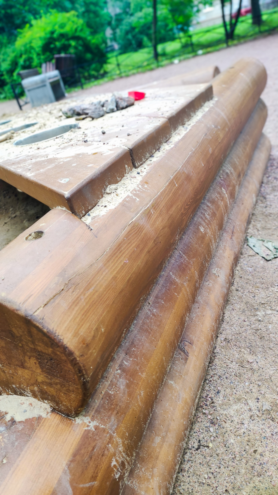 Крупный план деревянной песочницы: полукруглые бревна образуют бортик, на поверхности видны следы песка, пыль, потертости и царапины, отверстие под крепеж. На заднем плане различимы гравийная дорожка, урна и зеленые кусты, что указывает на дворовую зону отдыха. Съемка выполнена в Санкт-Петербурге, МО Автово, в летний период (июнь 2024) по визуальным признакам листвы. Фото подойдет для материалов о благоустройстве, детских площадках и эксплуатации уличного оборудования.