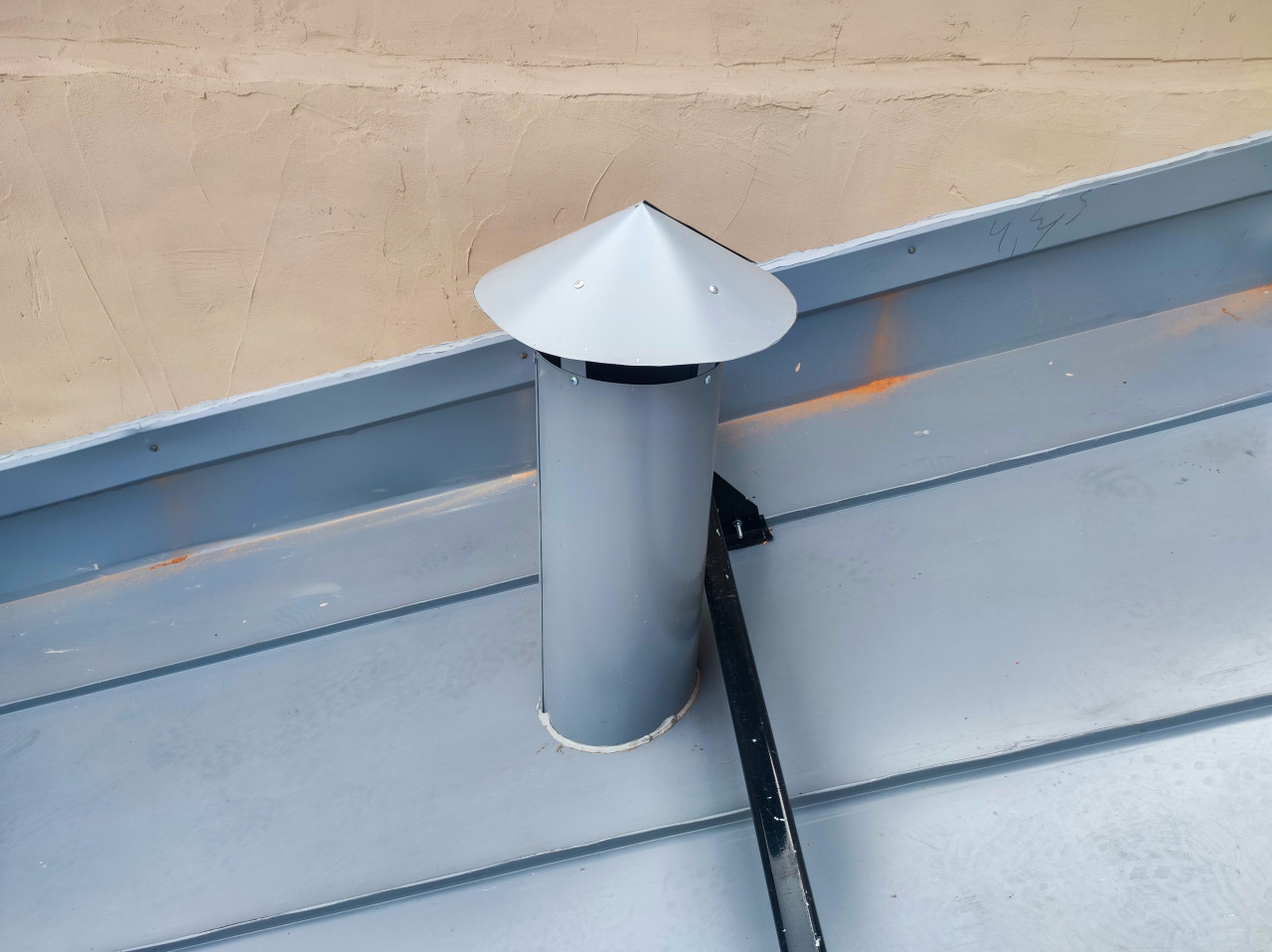 крыша кровля металлическая кровля фальцевая кровля ремонт кровли вентиляционная труба вентиляционный выход дефлектор защитный колпак проходка через кровлю уплотнение металлическая крыша парапет примыкание крепеж саморезы герметизация монтаж обслуживание ремонт крыши инженерные системы вентиляция здания дымоходный элемент снегозадержание черная планка следы потеков строительные детали технический снимок дневной свет крупный планПохожие фотографии